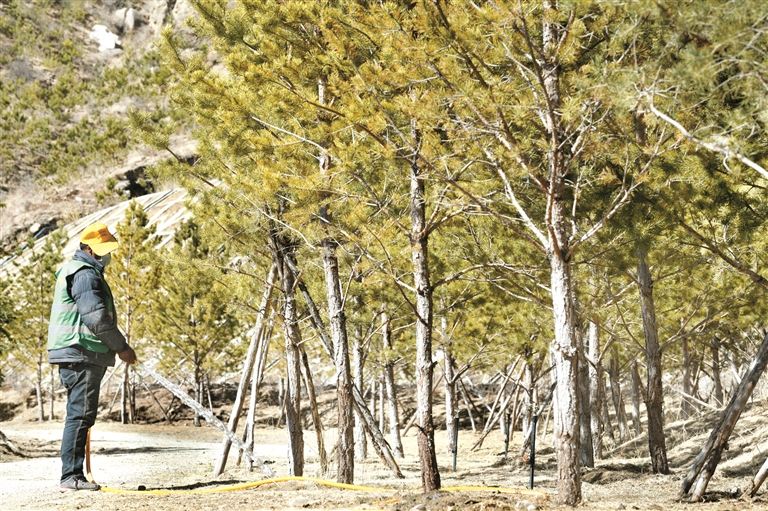 山上有了樹(shù)遠(yuǎn)遠(yuǎn)不夠,還要進(jìn)一步提高樹(shù)木的成活率,而樹(shù)木的成活率離不開(kāi)后期的管護(hù)工作。因此,每年春天山體解凍后,就要保證每周給樹(shù)木澆一次水。另外,由于拉薩紫外線(xiàn)強(qiáng)度大、水分蒸發(fā)量高,有時(shí)還需要給樹(shù)木輸送營(yíng)養(yǎng)液……因此,一批批踏著晨露、身披晚霞的樹(shù)木養(yǎng)護(hù)工人每天穿梭于山間,檢查樹(shù)木的生長(zhǎng)情況,進(jìn)行補(bǔ)植補(bǔ)栽、灌溉等工作。拉薩市圣地園林公司相關(guān)負(fù)責(zé)人多布拉告訴記者:“我們從3月8日開(kāi)始復(fù)工,作為園林工作人員,搶抓季節(jié)很重要,所以我們現(xiàn)在正在進(jìn)行補(bǔ)植補(bǔ)栽。”
