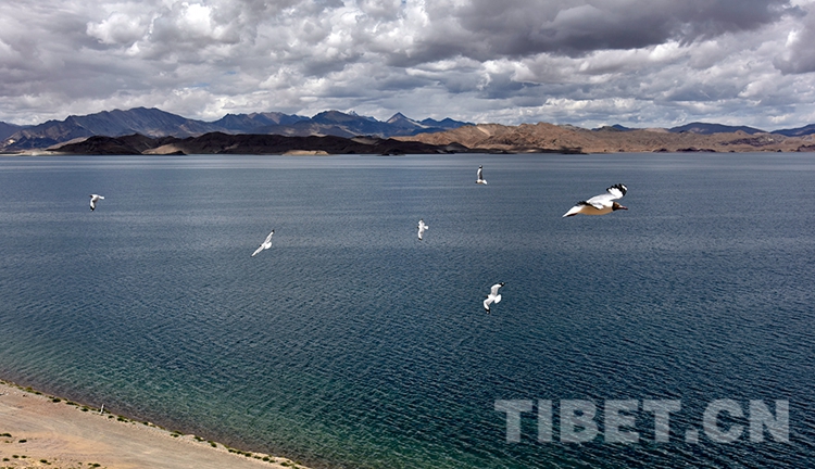 團(tuán)團(tuán)云朵懸停藍(lán)天,班公湖湖面微波蕩漾。湖岸藏野驢、黑頸鶴悠閑漫步;湖邊棕頭鷗滑翔游弋、魚翔淺底。“世界屋脊的屋脊”,人們“不負(fù)青山”,也收獲了“金山銀山”。(中國(guó)西藏網(wǎng) 記者/王媛媛)