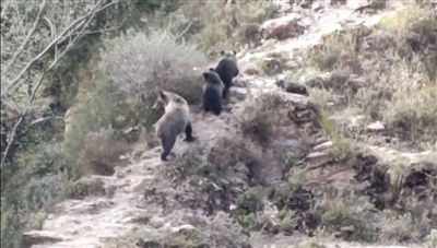 黑豹野生動(dòng)物保護(hù)站站長(zhǎng)李理介紹:“我們傍晚5點(diǎn)左右架設(shè)好設(shè)備, 6點(diǎn)30分左右就拍到藏棕熊了,當(dāng)時(shí)非常興奮”。他說(shuō):“當(dāng)時(shí)天馬上就黑了,山里忽然下起了冰渣子,藏棕熊就在樹(shù)林間若隱若現(xiàn),后來(lái)它跑到一個(gè)光禿禿的山下,它狀態(tài)很好,非常健壯。”很快,大家又發(fā)現(xiàn)了第二只。隊(duì)員們的衣服都被冰渣子打濕了,高山上非常冷,但還是給相機(jī)做好防水,拍下了這寶貴的畫(huà)面。第二天傍晚,還是在同一地點(diǎn),前一天晚上觀測(cè)到的一只藏棕熊再次出現(xiàn),不過(guò)這次,它帶了兩只小熊。大公熊強(qiáng)壯而霸道,帶幼崽的母熊小心謹(jǐn)慎,小熊憨態(tài)可掬,都非??蓯?ài)。