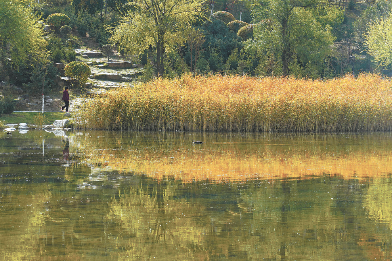 “你看,現(xiàn)在的北山腳下有花有樹(shù)有池塘。雖然現(xiàn)在已經(jīng)是秋季,但是這里的各色彩葉植被讓秋天的景色更加迷人。在這樣的環(huán)境里晨練遛彎,身心都舒暢許多?!笔忻裆蛘冁氛f(shuō)。