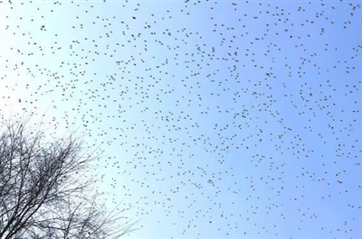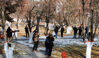 11月25日,記者來(lái)到海棠公園,從園方劉主任處了解到,太平鳥(niǎo)大約是一周前陸續(xù)來(lái)到海棠公園的,由最初的幾十只到現(xiàn)在的幾百只,甚至上千只,越聚越多。以前每年海棠公園也會(huì)有太平鳥(niǎo)光顧,但是沒(méi)有今年這么多。太平鳥(niǎo)每年來(lái)到海棠公園主要是來(lái)吃海棠果的,海棠公園500棵海棠樹(shù),入冬后果實(shí)變得透紅,一串一串的紅果果,吸引了無(wú)數(shù)太平鳥(niǎo)到這里聚餐,成為海棠公園一道獨(dú)特的風(fēng)景。因每年這個(gè)時(shí)候都是太平鳥(niǎo)來(lái)海棠公園做客的時(shí)間,11月24日下午,海棠公園里早早的就聚集了二三十個(gè)等候的攝影師,其中有來(lái)自四川、甘肅、山西的,也有當(dāng)?shù)氐臄z影愛(ài)好者。他們扛著“長(zhǎng)槍短炮”不畏嚴(yán)寒蹲守著,全力以赴抓拍著太平鳥(niǎo)的美麗身姿。