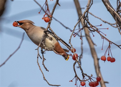 記者從省動(dòng)物學(xué)會(huì)鳥(niǎo)類(lèi)學(xué)分會(huì)成員胡老師處了解到,11月24日下午他也在海棠公園觀賞太平鳥(niǎo),從比例估算這次大約有一千多只太平鳥(niǎo)飛來(lái)海棠公園,是近年來(lái)出現(xiàn)鳥(niǎo)兒最多的一年。去年海棠公園出現(xiàn)了約三百多只太平鳥(niǎo),2017年、2018年它們出現(xiàn)的比較分散,在南山公園、寧湖濕地公園、海棠公園都有出現(xiàn),每處數(shù)量也只有五六十只,2018年在大通濱河公園也出現(xiàn)過(guò),數(shù)量有二三十只左右。太平鳥(niǎo)在青海早就有記錄,太平鳥(niǎo)為鳥(niǎo)綱太平鳥(niǎo)科、體長(zhǎng)約18厘米、壽命約13年左右。它們喜歡吃漿果,所以海棠果也就成為了它們的美味佳肴,春天也吃垂柳嫩葉,一般棲息于針葉、闊葉混交林中。
