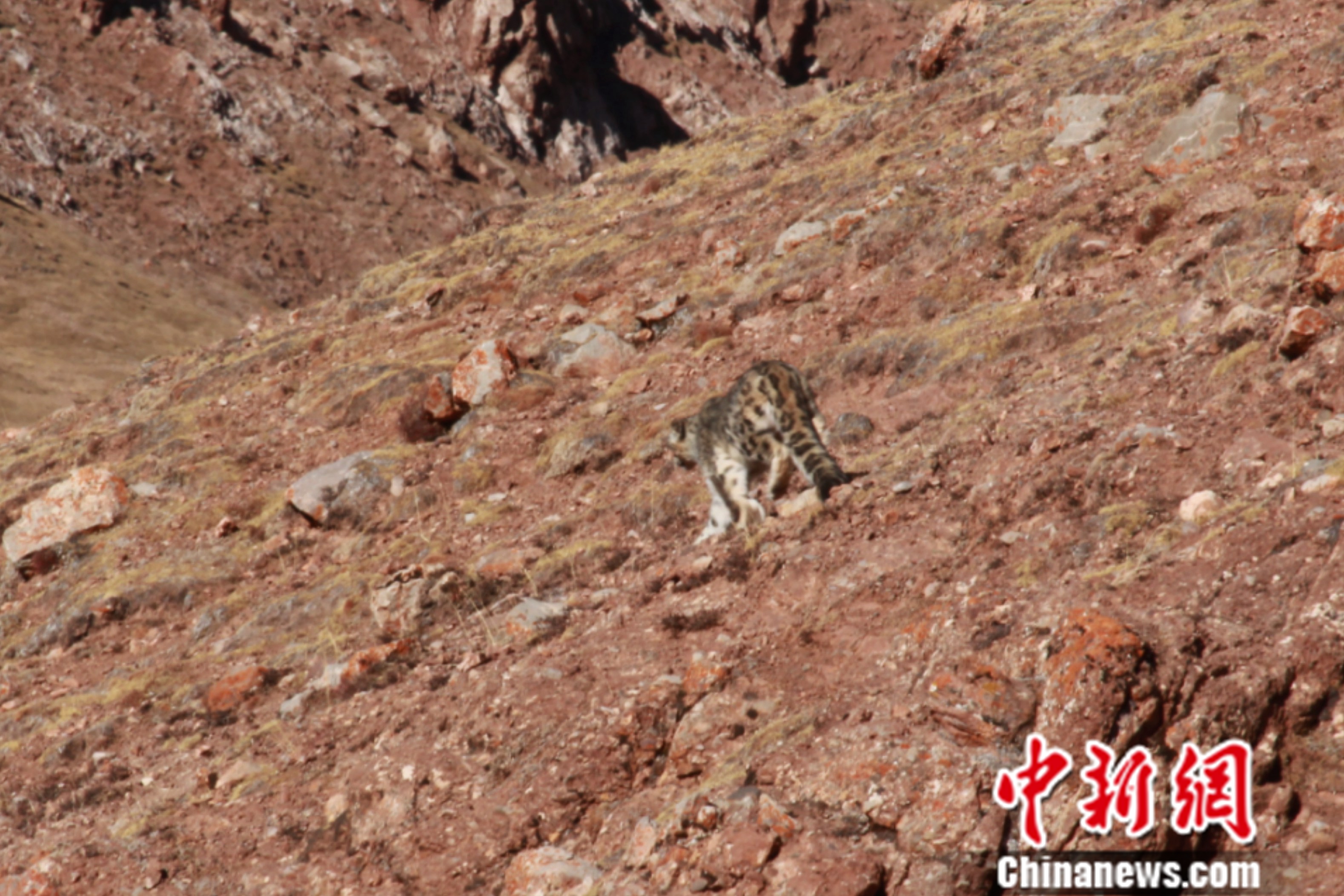 中新社記者看到,羅松扎西拍攝的動物臥在山坡上,酷似雪豹,但其皮毛顏色跟金錢豹接近,即呈現(xiàn)棕黃色,遍布斑點和環(huán)紋。