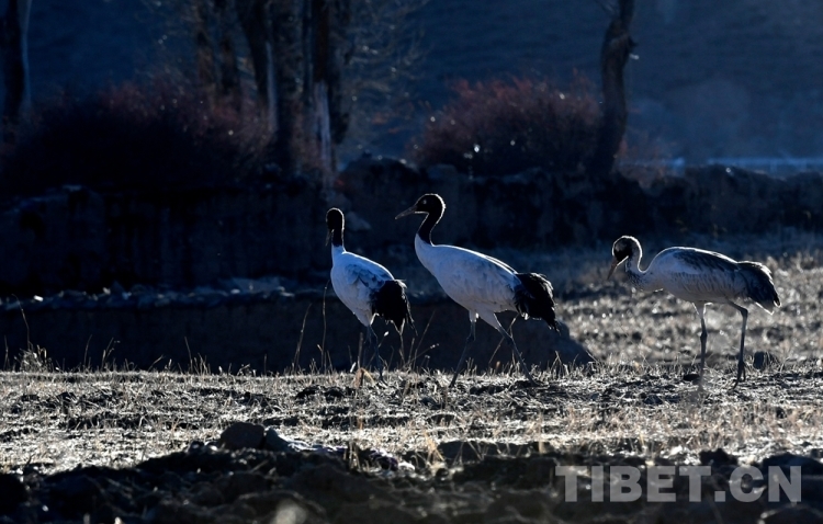 圖為黑頸鶴在林周縣境內(nèi)的田野覓食 攝影:王媛媛