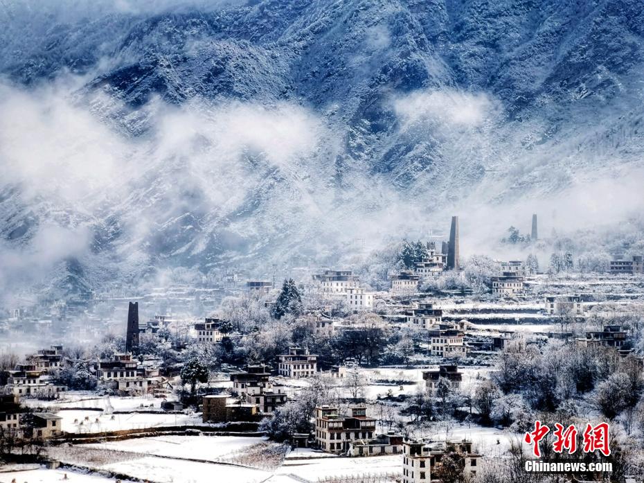 圖為云霧白雪下的丹巴中路鄉(xiāng)藏寨和古碉。 阿羅 攝