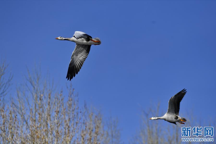 斑頭雁飛翔在拉魯濕地上空(3月7日攝)。新華社記者 張汝鋒 攝