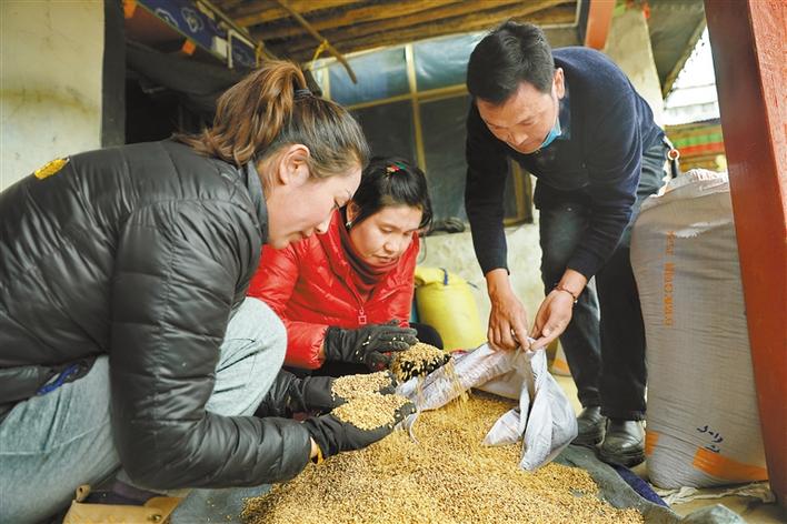 圖為墨竹工卡縣農(nóng)業(yè)農(nóng)村局(農(nóng)業(yè)技術(shù)推廣站)工作人員選購青稞種子。洛??酥?唐斌 攝