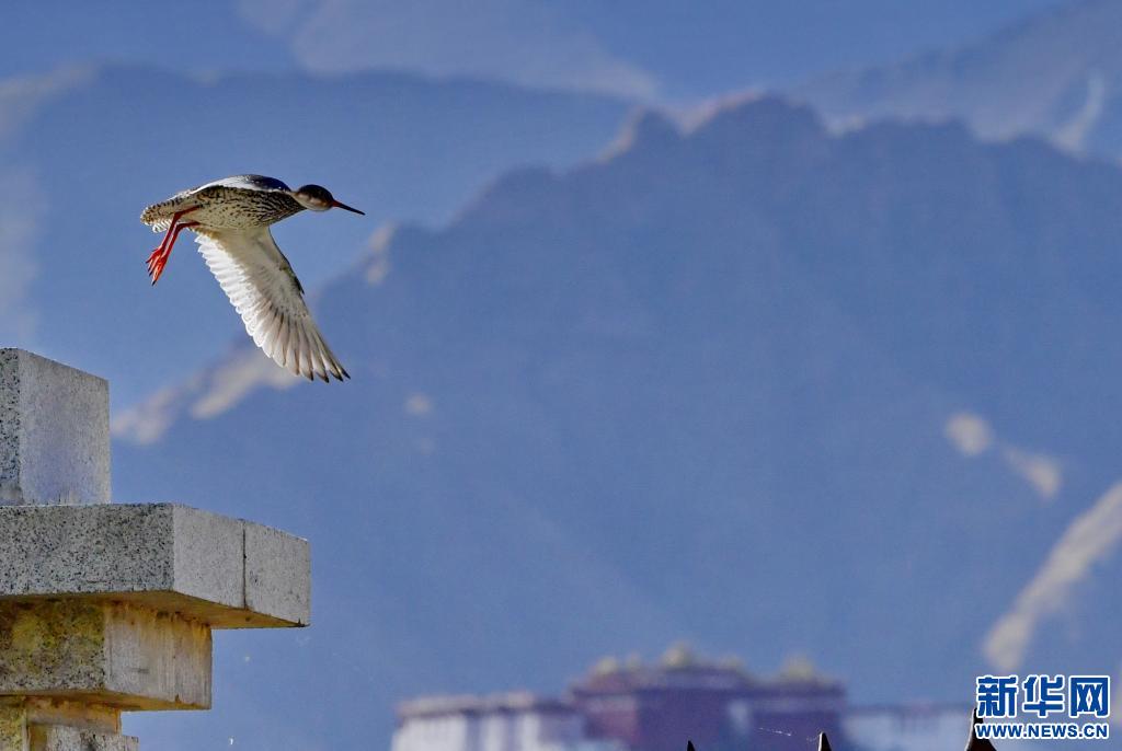 紅腿鷸在拉魯濕地上空飛舞(6月2日攝)。新華社記者 張汝鋒 攝
