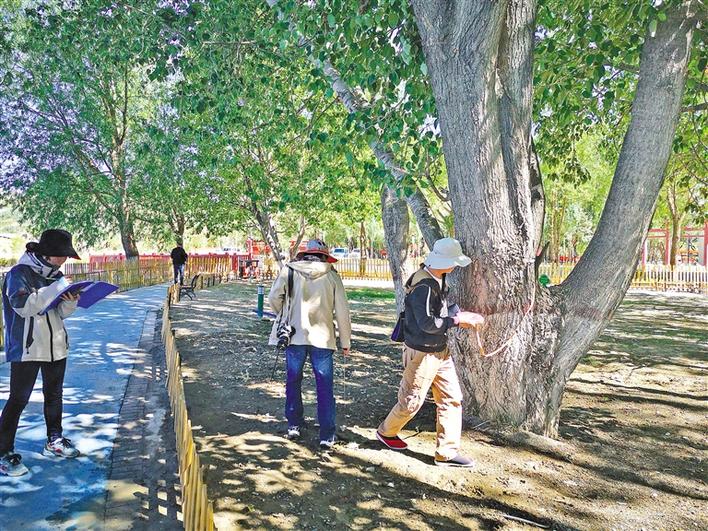 圖為西藏農(nóng)牧學(xué)院的師生在測(cè)算貢覺林卡內(nèi)古樹的相關(guān)數(shù)據(jù)。記者 扎西頓珠 攝