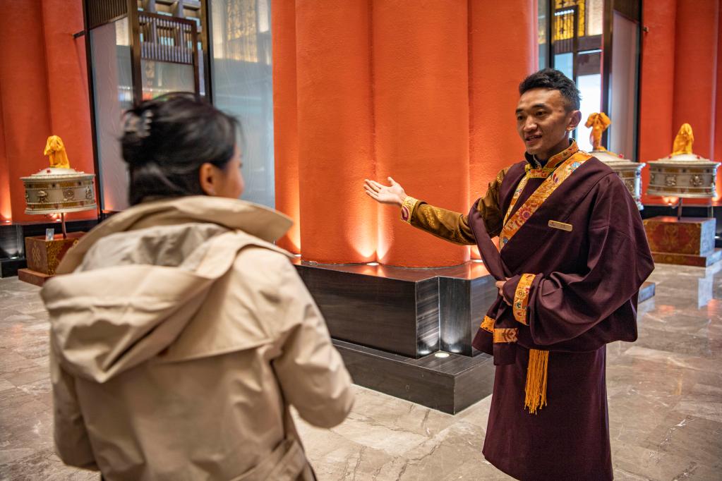 在魯朗恒大酒店,旦增正在引導客人(4月2日攝)。新華社記者 孫非 攝