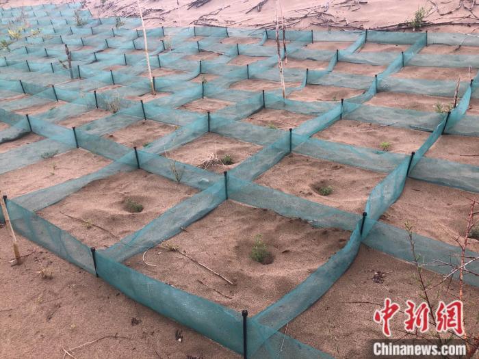 “傳統(tǒng)的方法是用廢樹枝等擺成方格等一定的形狀壓沙,里面再種上植物,效果很好但樹枝往往四五年就腐爛了;最近我們?cè)趪L試推廣一種新型化學(xué)材料方格,成規(guī)??欤夷芫S持七到十年?!敝袊?guó)科學(xué)院西北生態(tài)資源研究院研究員常學(xué)向?qū)τ浾哒f(shuō)。