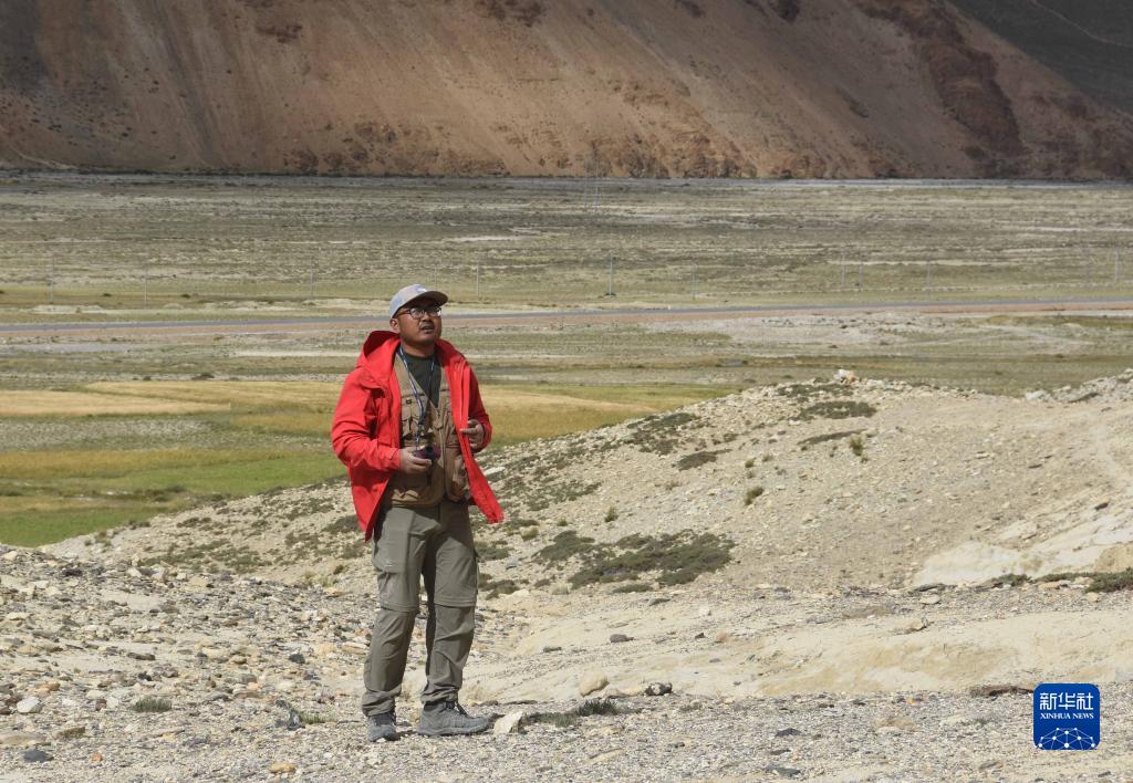 8月30日,在西藏日喀則市定日縣,中科院地理科學(xué)與資源研究所客座教授李渝生使用放大鏡觀察巖石。新華社記者 杜剛 攝