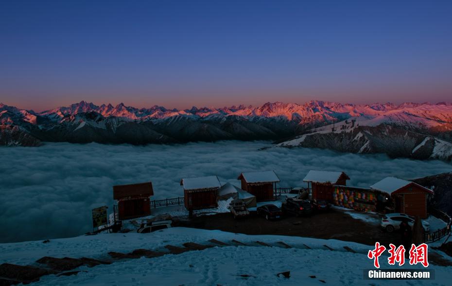 連日來(lái),位于四川省雅安市寶興縣磽磧藏族鄉(xiāng)的達(dá)瓦更扎景區(qū)雪后放晴。期間,日出、藍(lán)天、云海、雪山、星空等美景如畫,夢(mèng)幻飄渺,蔚為壯觀。圖為日照金山。高華康 攝