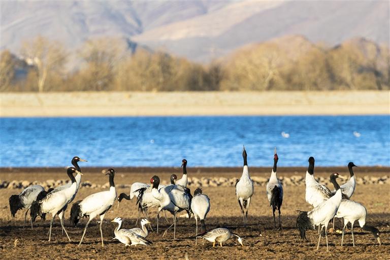 隨著西藏不斷加大黑頸鶴棲息地保護(hù)力度,黑頸鶴的生存環(huán)境進(jìn)一步改善。每年十月中下旬,大批黑頸鶴從藏北高原飛到拉薩河谷,它們在農(nóng)田、沼澤地里覓食嬉戲,享受冬日暖陽。