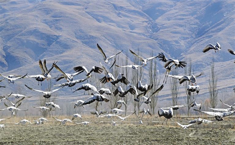 冬日的山南,又一次迎來了一群特殊的客人——黑頸鶴。成群的黑頸鶴在田野悠閑地覓食、嬉戲,給冬季增添了生機(jī)和活力,呈現(xiàn)出一幅人與自然和諧相處的絕美畫卷。