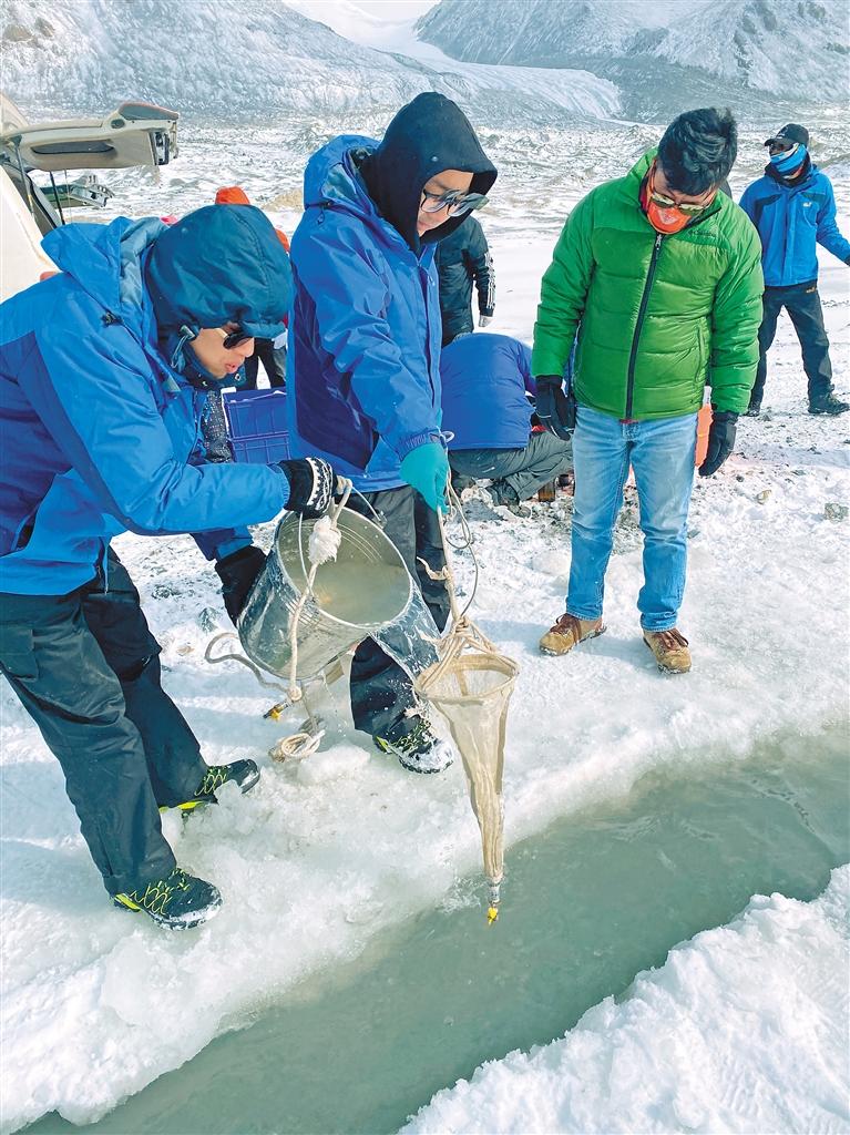 為全面系統(tǒng)摸清水質(zhì)狀況,監(jiān)測(cè)組在崗加曲巴冰川末端融水河流斷面開展了水溫、電導(dǎo)率、溶解氧、PH值的現(xiàn)場(chǎng)監(jiān)測(cè),同時(shí)開展了微塑料、抗生素等指標(biāo)的全分析及生態(tài)監(jiān)測(cè)的采樣工作。