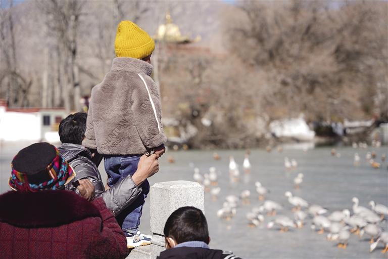 如果你想觀賞候鳥(niǎo),可以前往拉薩3號(hào)壩橋,清澈的水面上候鳥(niǎo)聚集成群。米瑪頓珠和老伴站立在橋面上,靜靜欣賞著候鳥(niǎo),時(shí)不時(shí)還有候鳥(niǎo)飛過(guò)他們的頭頂,在半空中盤(pán)旋一番,再落到水面。