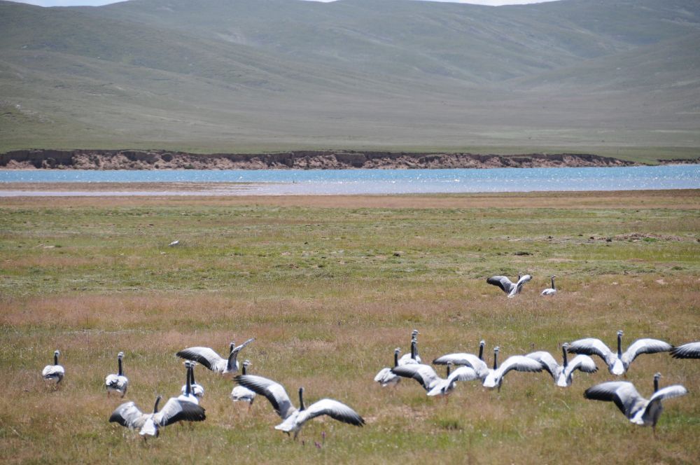 2020年8月19日,在三江源國家公園黃河源園區(qū)內(nèi),一群斑頭雁在黃河邊草地上翩然起飛。新華社記者 呂雪莉 攝