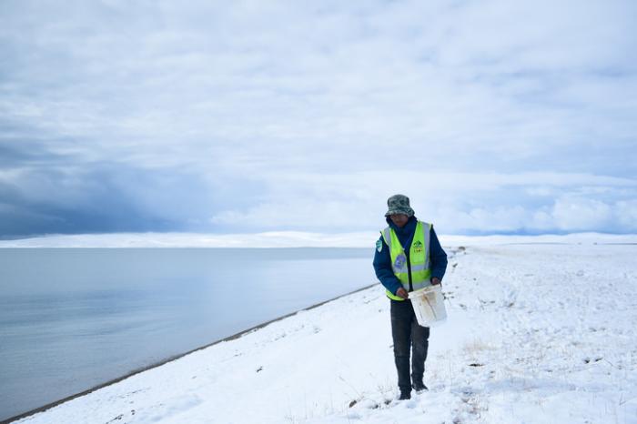 2021年10月,三江源國(guó)家公園黃河源園區(qū)生態(tài)管護(hù)員俄措在扎陵湖邊撿拾垃圾。新華社記者張龍攝