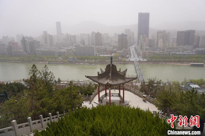 圖為3月24日,從蘭州市白塔山上,眺望被沙塵籠罩的黃河對(duì)岸城區(qū)?!【琶赖┰?攝