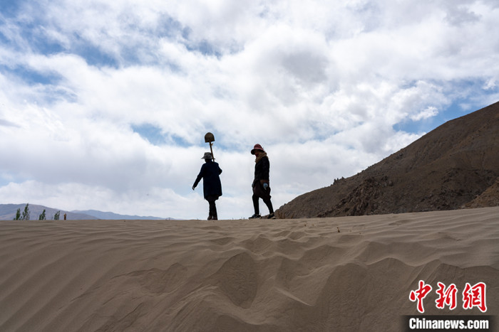 圖為4月18日,西藏雅魯藏布江畔的農(nóng)牧民植完樹后行走在一處沙丘上。 中新社記者 江飛波 攝