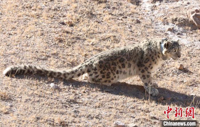 圖為佩戴衛(wèi)星追蹤項圈的雪豹被放歸?!∑钸B山國家公園青海省管理局供圖