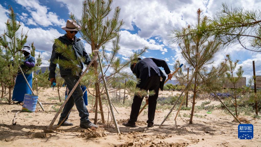 在西藏山南市扎囊縣,邊久(前)在雅江邊的造林地里指導(dǎo)工人種樹(5月26日攝)。新華社記者 孫非 攝
