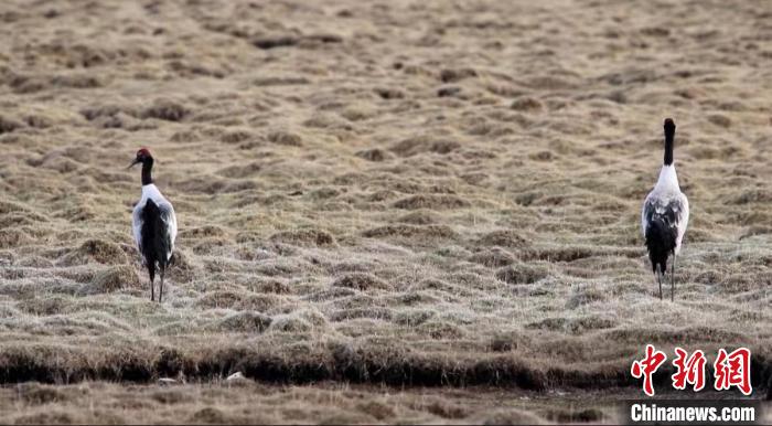 圖為兩只黑頸鶴在濕地中悠閑踱步。 天峻縣融媒體中心 供圖