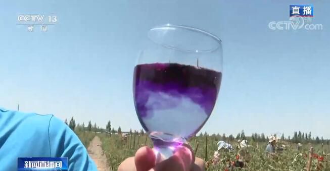除了紅枸杞之外,這里還種植了15000多畝的有機黑枸杞,黑枸杞的成熟時間要遲一些,在8月下旬,所以我現(xiàn)在手里只有黑枸杞干。大家可以看一看,如果我們把它也像紅枸杞一樣泡入水中的話,顏色展開得非???,幾秒鐘的時間水就已經(jīng)是藍紫色了。當?shù)氐呢撠?zé)人告訴我,這很大程度是因為它的花青素含量高,所以黑枸杞也有另外一個名字,叫作“花青素之王”。