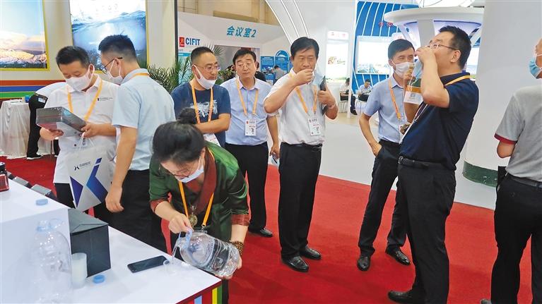 近年來,西藏加快發(fā)展飲用水產(chǎn)業(yè),積極拓展飲用水產(chǎn)品銷售渠道,在區(qū)內(nèi)外各種展覽會(huì)、展銷會(huì)、博覽會(huì)上大力推銷水產(chǎn)品。 圖為2020廈門國際投資貿(mào)易洽談會(huì)暨絲路投資大會(huì)上,與會(huì)者在展示展銷會(huì)現(xiàn)場品鑒西藏“地球第三極”產(chǎn)業(yè)發(fā)展有限公司生產(chǎn)的天然飲用水產(chǎn)品。(資料圖片)記者 王超 攝