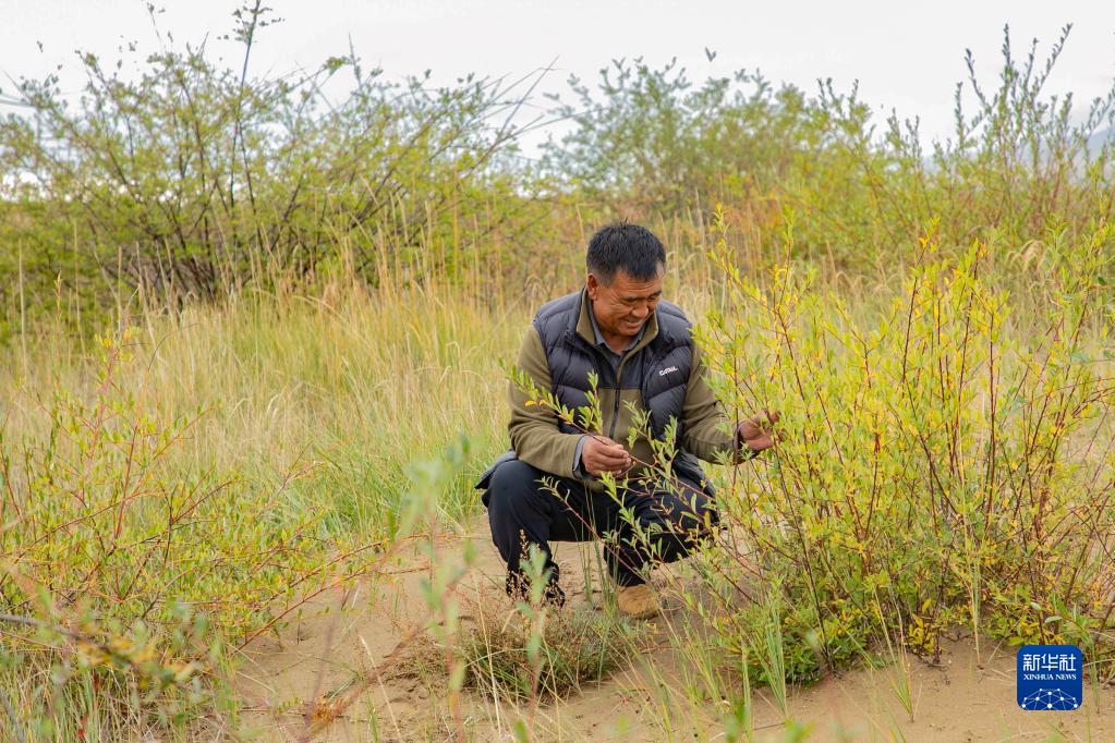 瑪曲縣自然資源局高級工程師馬建云在黃河瑪曲段干流沿岸的一處阻沙林帶建設(shè)區(qū)域觀察草方格沙障內(nèi)植被生長情況(9月16日攝)。新華社記者 郎兵兵 攝