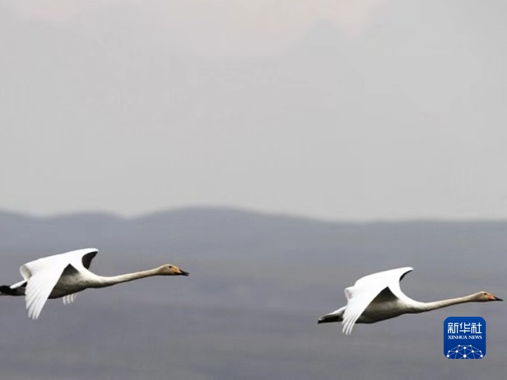 9月17日,在青海湖畔上空的大天鵝。新華社 孫建青 攝