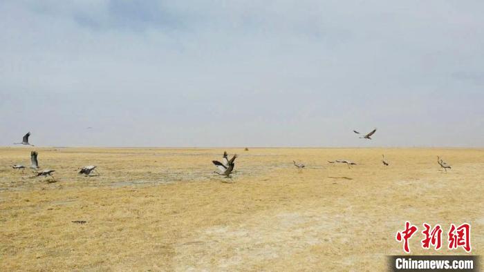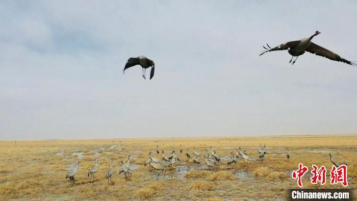 監(jiān)測顯示,格爾木市拖拉海草原是蓑羽鶴遷徙過程中的重要停歇地。每年十月初左右,少則數(shù)百只多達數(shù)千只蓑羽鶴都會聚集于此,補充能量,再蓄力南飛。它們在這里涉水覓食,振翅高飛,水草豐美的濕地為它們提供了歇腳的舒適環(huán)境。