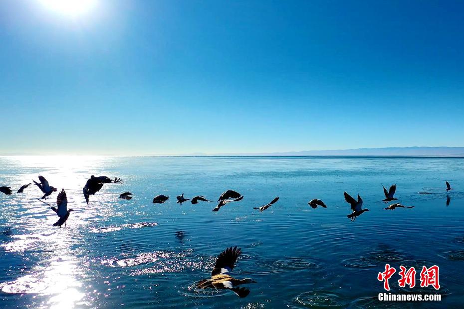 青海湖湖面封凍如破碎“玉帶”