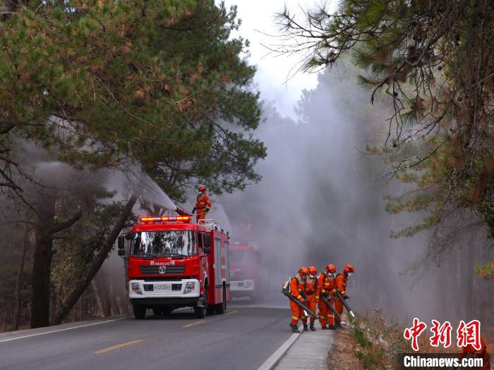 圖為森林消防員正在進(jìn)行灑水增濕作業(yè)?!“鸵藚^(qū)森林消防中隊(duì)供圖