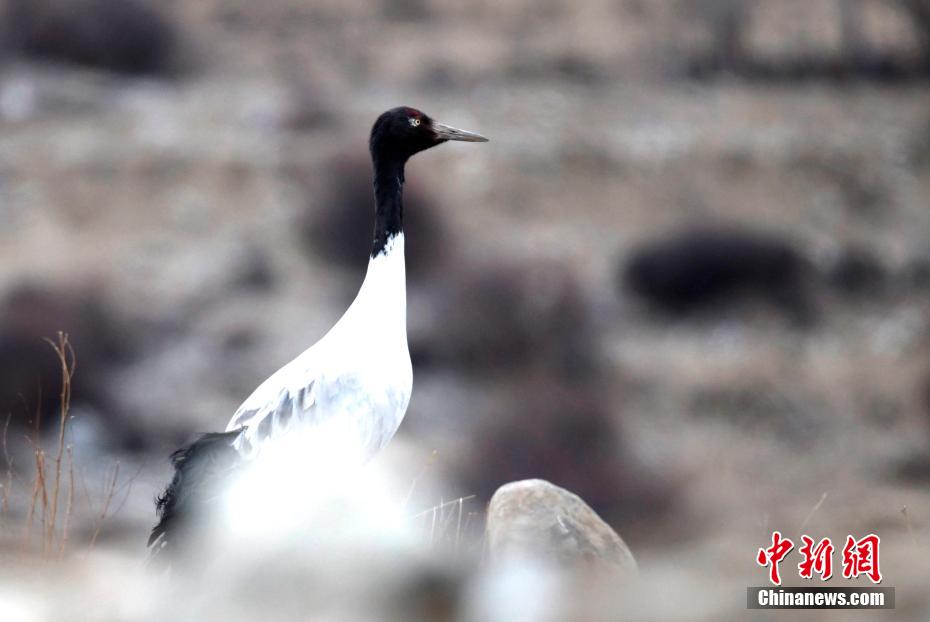 在拉薩市林周縣的農(nóng)田里覓食的黑頸鶴(3月1日攝)。新華社記者 張汝鋒 攝