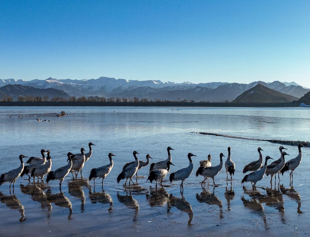 在拉薩市林周縣卡孜水庫(kù)拍攝的黑頸鶴(3月1日攝)。新華社記者 孫非 攝