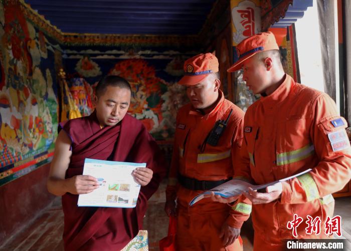 “景區(qū)內(nèi)的宗教寺廟木質(zhì)結(jié)構(gòu)比較多,周圍森林資源豐富,平時要注意用火安全,防止火災發(fā)生?!边@是林芝市森林支隊消防員正在為德木寺景區(qū)工作人員和僧人宣傳森林消防安全常識。