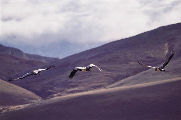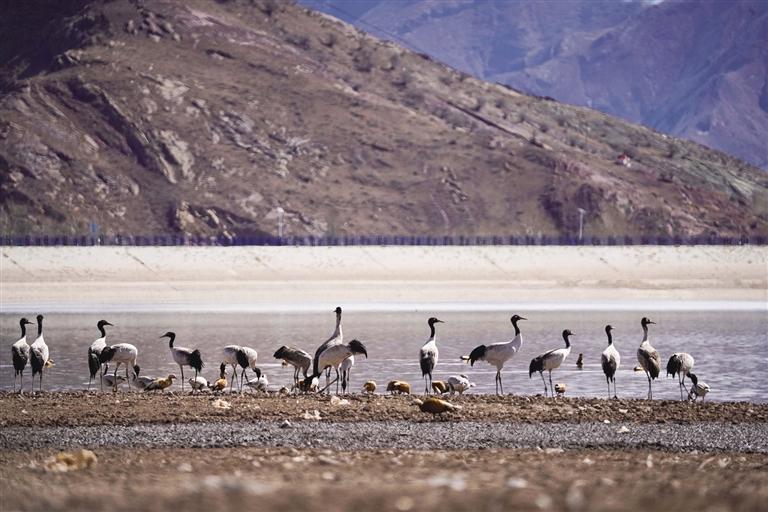 黑頸鶴是國家一級保護動物,在藏語中稱為“沖沖”。主要棲息在海拔2500米至5000米的高原、草甸、沼澤地帶。拉薩北部的林周縣平均海拔約4200米,是黑頸鶴的主要越冬地之一。最近這段時間,對拉薩市林周縣野保員們來說,一邊要忙自家的農(nóng)活,一邊還要巡查候鳥情況。“已經(jīng)有一小部分飛走了,估計再過半個月都會陸續(xù)飛走?!?月23日上午,野保員旦增告訴記者,在虎頭山水庫和卡孜水庫越冬的候鳥有一部分已經(jīng)飛走了。野保員口中的“飛走”便是遷徙,遷徙是候鳥的本能,一年一年,跟隨時間的召喚,完成兩次遷徙:繁殖和越冬。