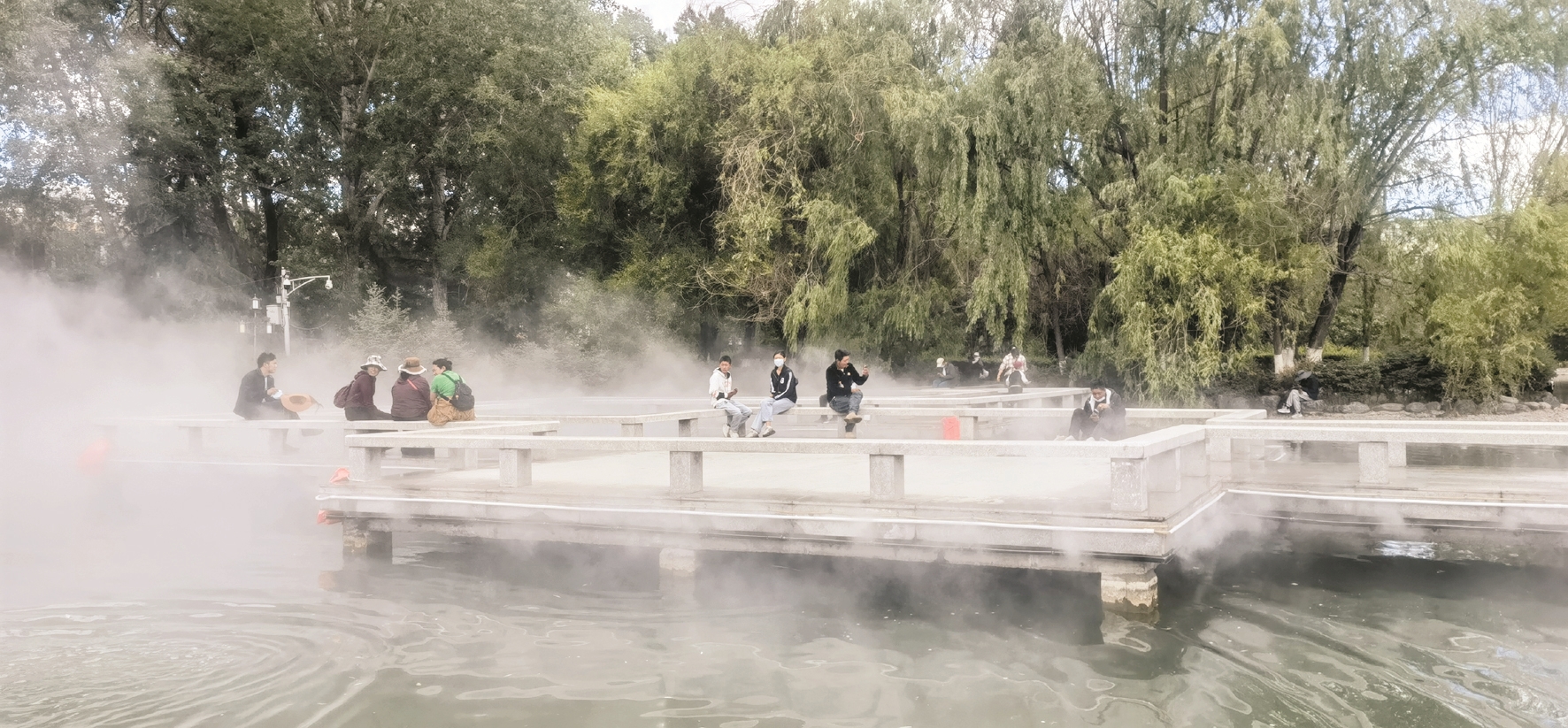 圖為市民在宗角祿康公園新增的九曲橋霧噴系統(tǒng)邊休憩。 拉薩融媒記者 楊 璐攝