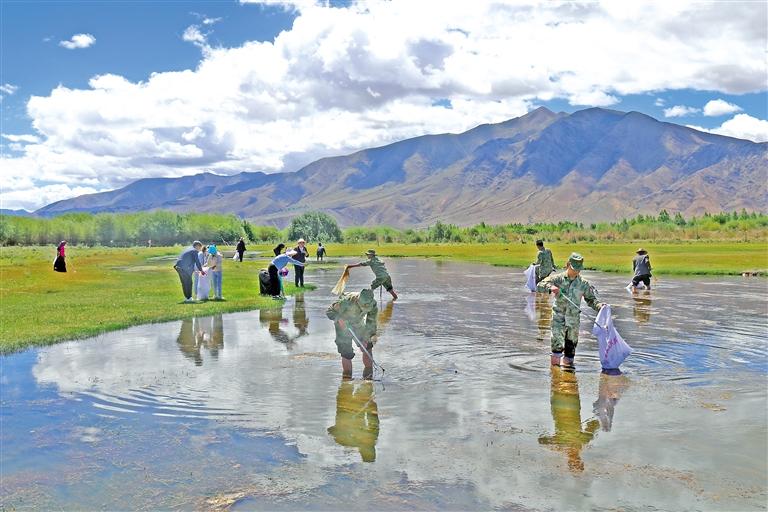 為充分尊重自然、順應(yīng)自然、保護(hù)自然,提高廣大黨員骨干的綠色環(huán)保意識(shí),6月30日,桑珠孜區(qū)人民武裝部聯(lián)合桑珠孜區(qū)退役軍人事務(wù)局,組織官兵與江當(dāng)鄉(xiāng)、年木鄉(xiāng)退役軍人、民兵黨員在雅江中游河谷黑頸鶴保護(hù)區(qū)開展呵護(hù)綠水青山“七一”主題黨日活動(dòng)?;顒?dòng)中,桑珠孜區(qū)人民武裝部組織黨員重溫入黨誓詞。隨后,30多名黨員開展了拉網(wǎng)式清理水域漂浮物和白色垃圾,給“高原精靈”營(yíng)造一個(gè)美麗舒適的“家”。