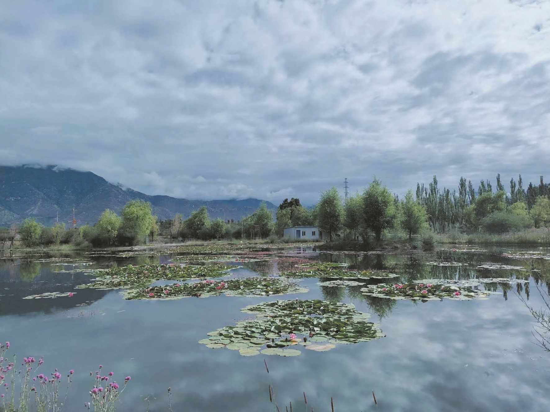 經(jīng)過反復(fù)試驗(yàn),王興邦從全國各地引進(jìn)的蓮花種苗逐漸適應(yīng)高原環(huán)境,從盆里移栽到池塘后,成活率達(dá)到90%以上。2019年,在拉薩高新區(qū)管委會的支持下,王興邦又獨(dú)自一人到拉薩高新區(qū)濕地公園內(nèi)種植蓮花。據(jù)王興邦回憶,那時的濕地公園僅是一片兩三百畝地的灘涂地,環(huán)境臟亂差,無人管理。夏季漲水后,形成高低不平的洼地,冬季來臨,土壤裸露。