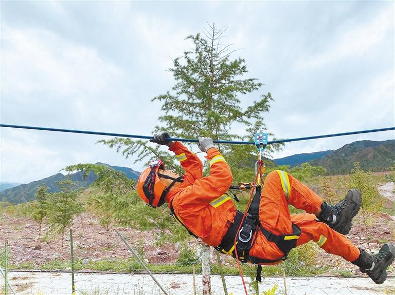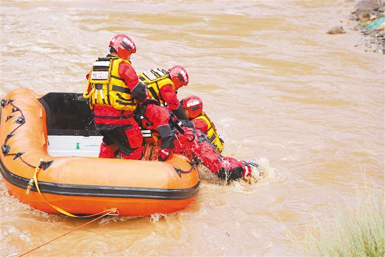 消防員模擬橫渡河流營救“被困人員”。