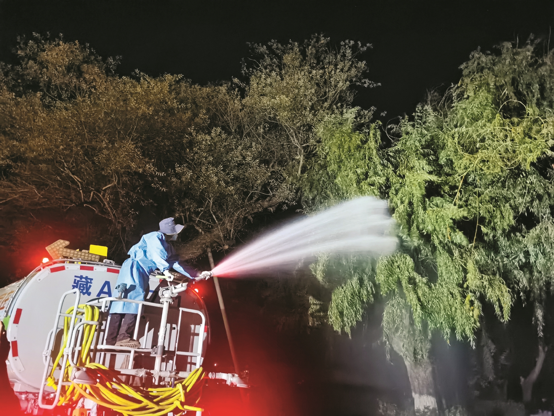 隨著夜幕降臨,羅布林卡公園內(nèi)市民游客逐漸散去,城關(guān)園林養(yǎng)護(hù)工人駕駛灑藥車開始入場(chǎng),準(zhǔn)備為園區(qū)內(nèi)的苗木進(jìn)行噴藥殺蟲作業(yè)。雨季過后,拉薩氣候較為干爽,為蟲害滋生提供了溫床,城關(guān)園林養(yǎng)護(hù)人員在前期排查發(fā)現(xiàn),羅布林卡公園廣場(chǎng)的苗木上有不同程度的柳葉蜂、柳大蚜蟲害現(xiàn)象。經(jīng)過技術(shù)人員的“把脈問診”,確定害蟲種類、生長階段后,城關(guān)園林當(dāng)天組織兩輛大型灑藥車對(duì)園區(qū)進(jìn)行集中作業(yè),以預(yù)防大范圍的蟲害以及幼蟲化蛹越冬。