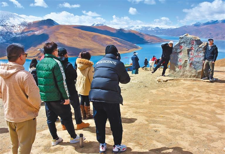 圖為游客在浪卡子縣羊卓雍措觀景臺拍照留念。記者 劉楓 攝