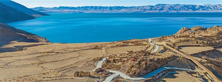 在當(dāng)惹雍錯(cuò)湖畔,尼瑪縣甲谷鄉(xiāng)吉松村剛剛竣工的棧道和觀景臺(tái)(無人機(jī)照片)。新華社記者 格桑朗杰 攝