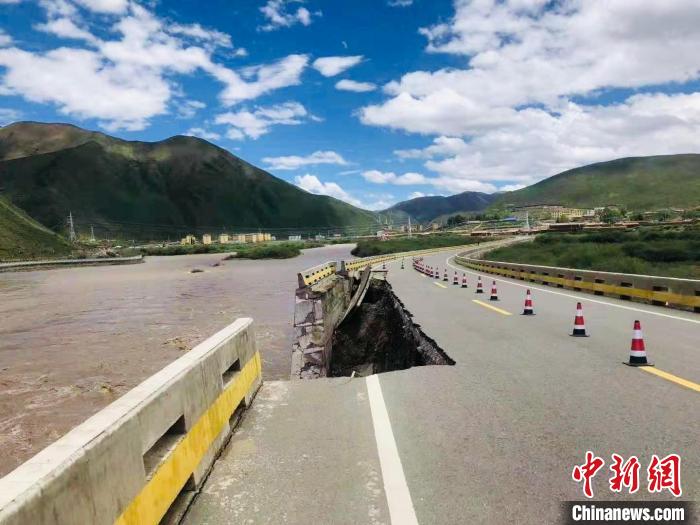 圖為2020年6月15日,青海果洛班瑪縣暴雨災(zāi)害造成道路被沖毀。青海省氣候中心供圖