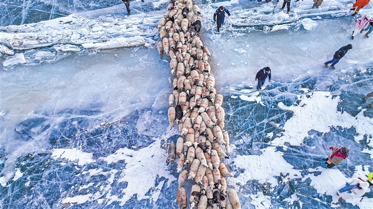 8點左右,羊群的冰上遷徙正式開始。
