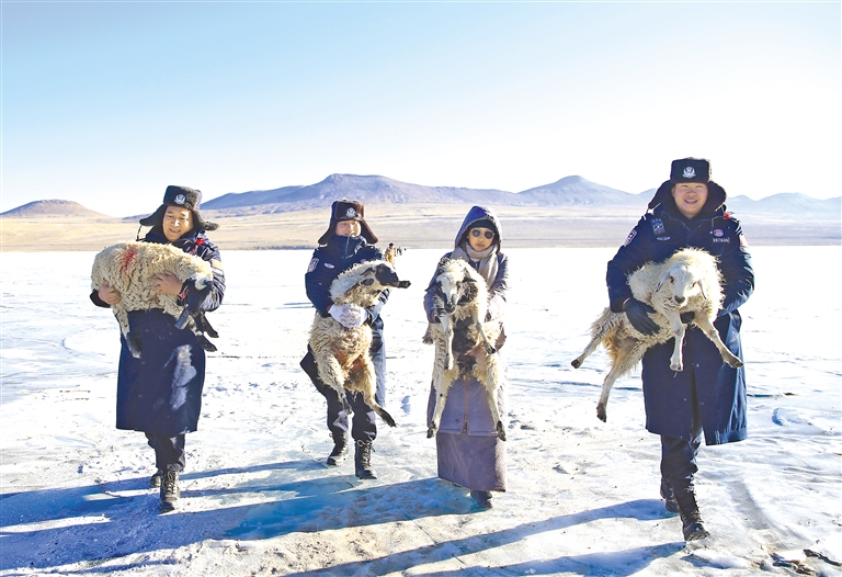 西藏出入境邊防檢查總站浪卡子邊境管理大隊民警幫助牧民將掉隊的綿羊抱往普莫雍錯的湖心島。記者 王杰學(xué) 通訊員 彭維熙 攝