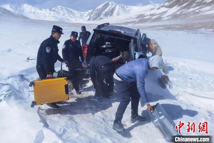 警車出發(fā)后行駛約1個小時抵達救援現(xiàn)場附近,由于道路積雪,事發(fā)地海拔超過5300多米,車輛無法繼續(xù)前行,民警徒步到達現(xiàn)場,先用便攜式氧氣瓶給高反嚴重的游客供氧。隨后民警對現(xiàn)場進行察看,發(fā)現(xiàn)車輛深陷積雪中,靠人力已無法脫困,決定先將被困人員及車上貴重物品帶回。